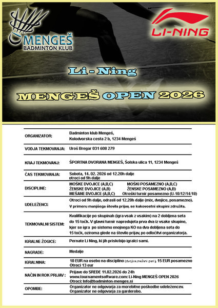 Vabljeni na 7. Li-Ning turnir sezone 2025/26, ki bo v Športni dvorani Mengeš 14.2.2026.